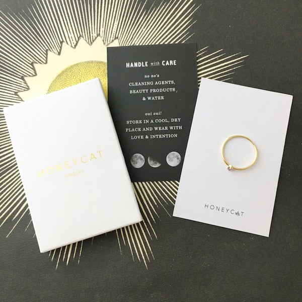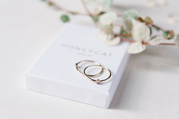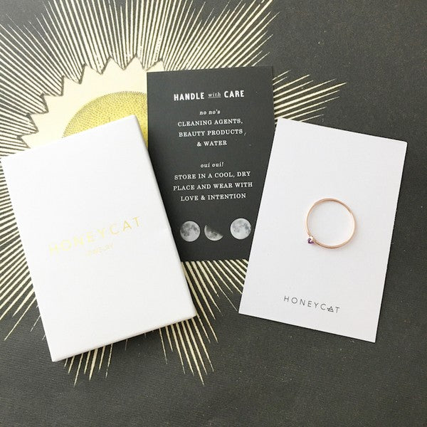 A tiny pointed Amethyst crystal delicately set upon a thin, smooth band. Equally gorgeous worn solo as it is stacked.