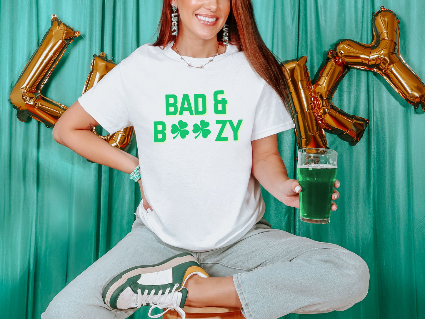 💚 Bold "Bad & Boozy" graphic with shamrocks – the ultimate St. Patrick’s Day vibe!