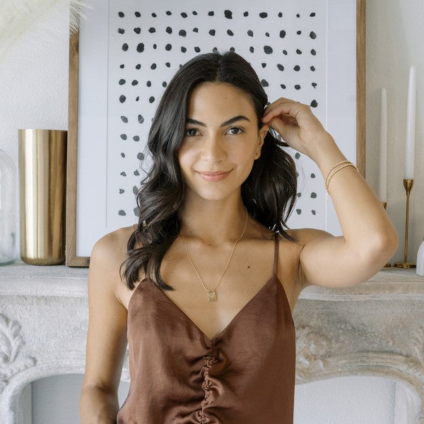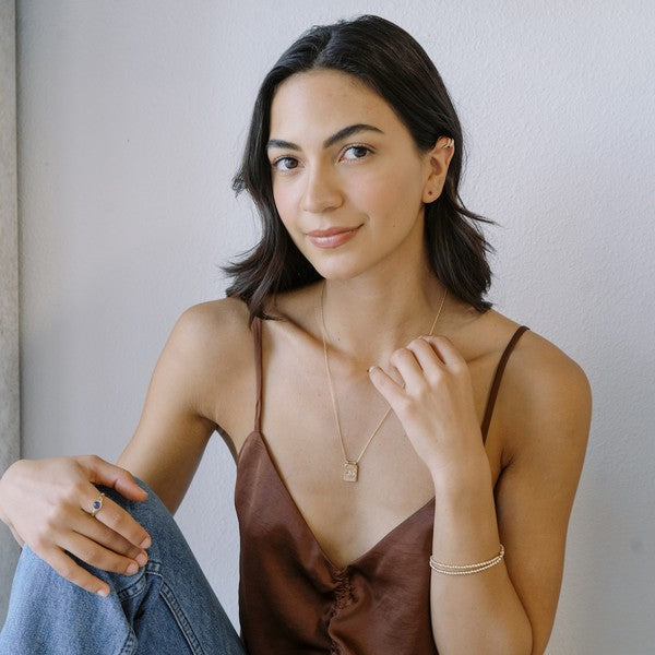 A radiating, sparkling evil eye pendant upon a thin chain necklace. The length is layering friendly with an adjustable length between 18" - 21". Measures 16mm x 12mm.