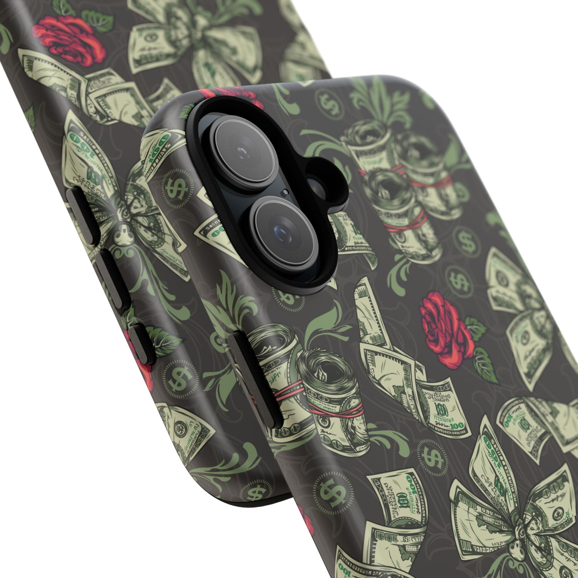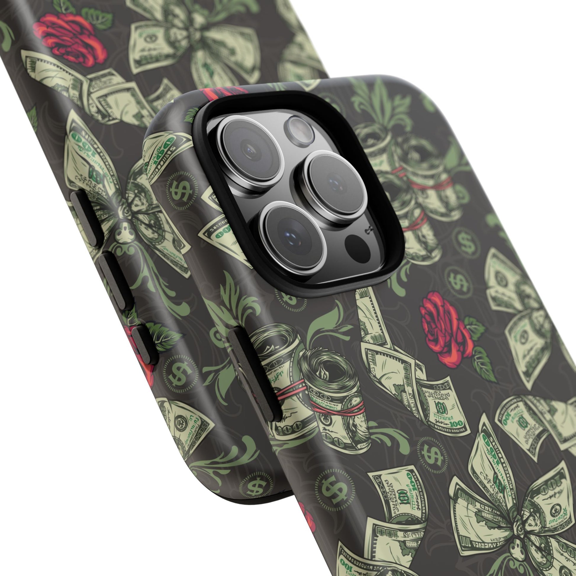 Bold Money & Roses case with stacked cash and floral graphic. Designed for those who want their phone to mirror grit and art.