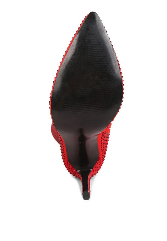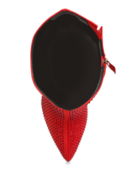 High Pointed heel boot with heat set diamante shines you through the party! It comes with an inside zipper opening which makes it easy to wear. The pointed heel and pointed toe in this calf boot make it chic!